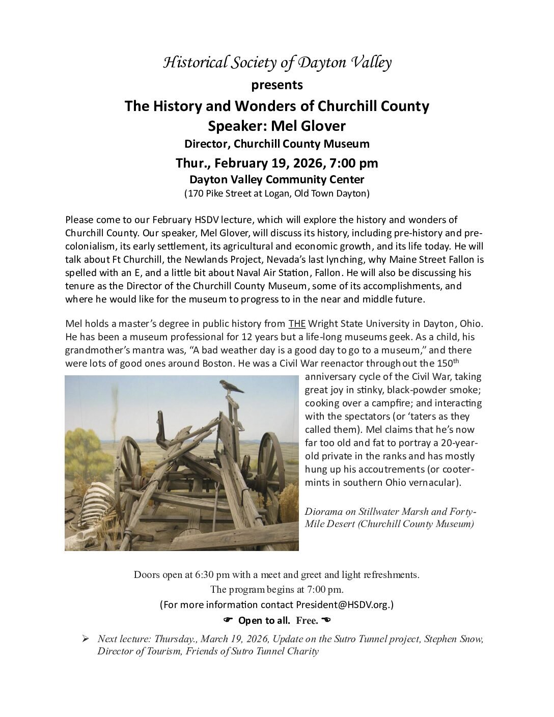 When: Thursday, February 19; Doors open at 6:30; Lecture starts at 7:00 pm Where: Dayton Valley Community Center This is the general membership meeting of the Historic Society of Dayton Valley. Each meeting includes brief announcements concerning activities of the Society and a presentation on a historical topic. See flyer below for more information on this month’s lecture. |